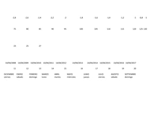 Le document présente une série de valeurs numériques et des dates, probablement liées à des données chronologiques ou statistiques. Il inclut différents intervalles de temps, ainsi que des références à des mois et des jours de la semaine. L'ensemble semble être un tableau de données sans contexte explicite sur son sujet ou son application.