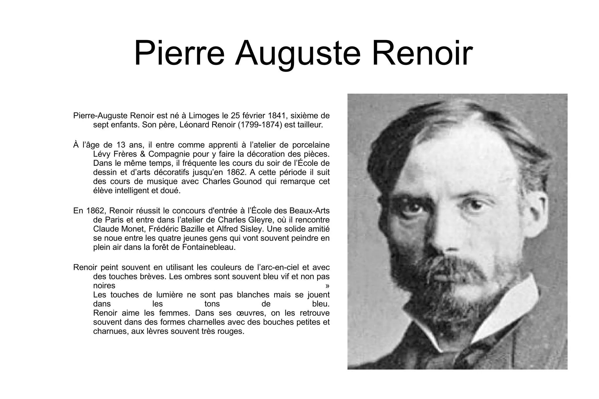 Pierre-Auguste Renoir, né en 1841, est un peintre influent de l'impressionnisme, connu pour ses œuvres vibrantes mettant en avant les femmes et des techniques de lumière novatrices. Après avoir étudié aux Beaux-Arts de Paris, il a formé une amitié avec Claude Monet et d'autres artistes, peignant souvent en plein air. Malgré des difficultés personnelles et de santé, il a continué à créer jusqu'à sa mort en 1919, produisant des œuvres emblématiques comme 'La Balançoire'.