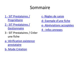 Le document fournit des directives pour la création et la gestion des fiches de prestataires touristiques, en distinguant les rôles de propriétaire et de gestionnaire. Il décrit les étapes à suivre pour vérifier l'existence d'un prestataire, ainsi que les règles de saisie incluant des abréviations spécifiques. Des informations annexes sur l'accès à l'interface de mise à jour sont également incluses.