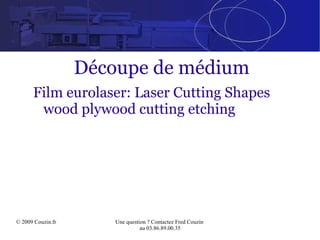 Le document présente des solutions de découpe au laser, mettant en avant la flexibilité des angles rentrants et des découpes fines. Il évoque spécifiquement la découpe de matériaux tels que le médium et le contreplaqué. Pour plus d'informations, un contact est fourni.
