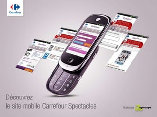 Le document décrit les fonctionnalités d'une application mobile de Carrefour Spectacles permettant d'accéder à des sorties culturelles, de consulter des informations sur les événements et de finaliser des achats de billets. Il mentionne également un espace personnel sécurisé pour les utilisateurs et fournit des contacts de l'agence Apocope, responsable de la conception de l'application. Enfin, il souligne les missions de l'agence liées à la stratégie mobile et digitale.