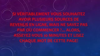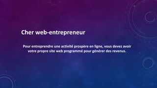 Le document présente une solution pour créer un site web générateur de revenus rapidement et facilement, ciblant les personnes souhaitant diversifier leurs revenus en ligne sans compétences techniques. Il propose un service clé en main qui permet aux utilisateurs de disposer d'un site e-commerce pré-programmé et monétisé, tout en incluant des guides de formation et des outils promotionnels. L'objectif est de simplifier l'accès à la création de revenus en ligne pour les débutants en évitant les erreurs courantes.