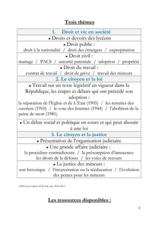 Le document présente le programme d'Education Civique, Juridique et Sociale (ECJS) pour les élèves de seconde, centré sur la citoyenneté, le droit et la justice. Il aborde les droits et obligations des citoyens, l'organisation judiciaire et des débats législatifs marquants, ainsi que des ressources pour approfondir ces thèmes. Des liens vers des documents et articles officiels sont fournis pour aider à la recherche et à la compréhension des droits des lycéens.