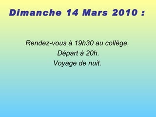 Séjour en Angleterre du 14 au 20 mars 2010 avec un programme détaillé incluant des visites à Londres, Cambridge, Brighton, Harrow, Leeds et Canterbury. Les élèves profiteront de visites guidées, d'activités variées et de repas fournis par les familles d'accueil. Le voyage comprend des trajets en bateau et en Eurotunnel, ainsi que des retours quotidiens dans les familles d'accueil dans le Kent.
