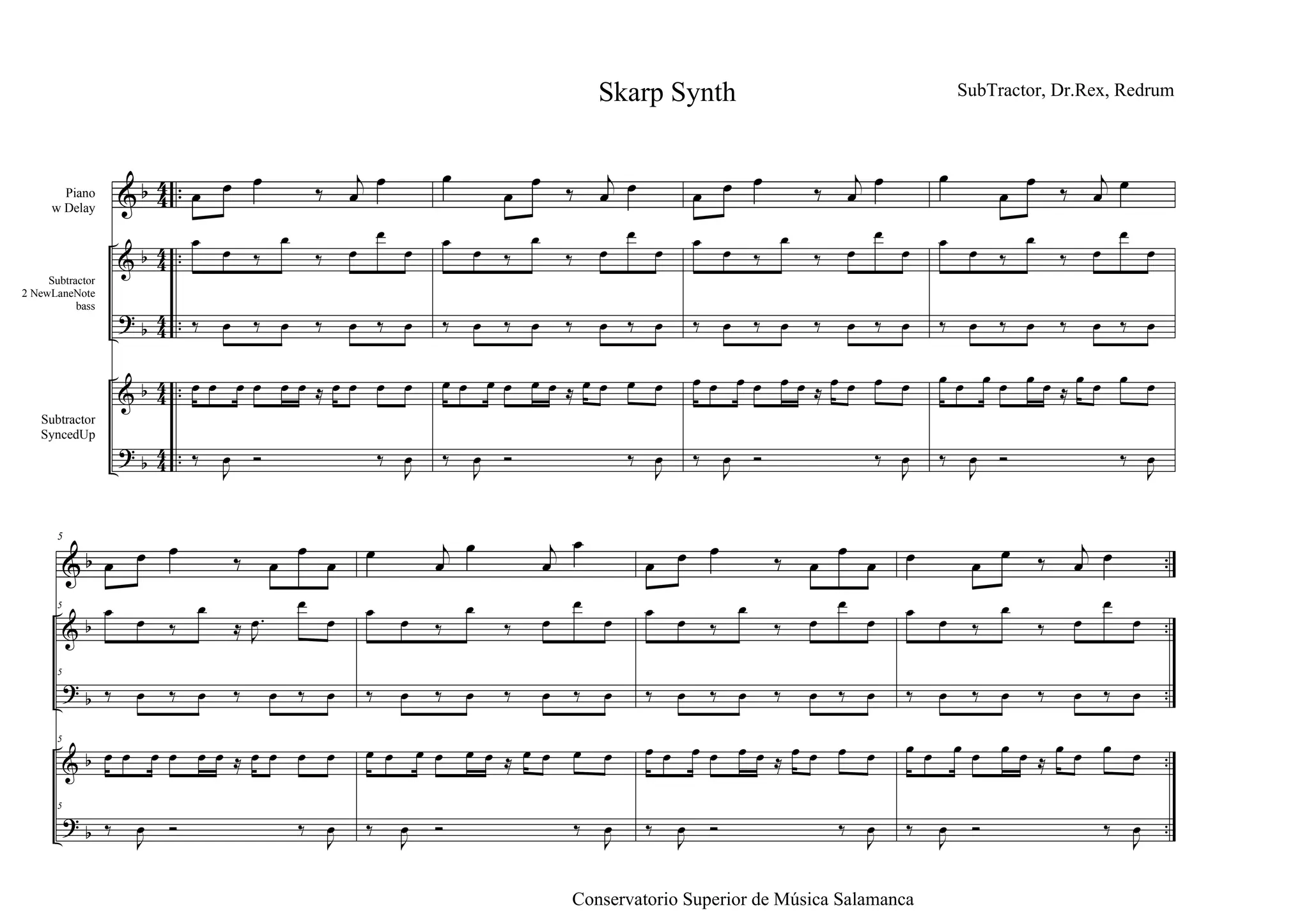 Le document présente une série de notations musicales et de séquences de sons à l'aide de différents instruments, tels que le synthétiseur Subtractor et le piano. Il semble contenir des instructions pour la création de morceaux de musique, ainsi que des éléments expérimentaux en matière de rythmes et de mélodies. L'origine de ces éléments est liée au Conservatorio Superior de Música de Salamanca.
