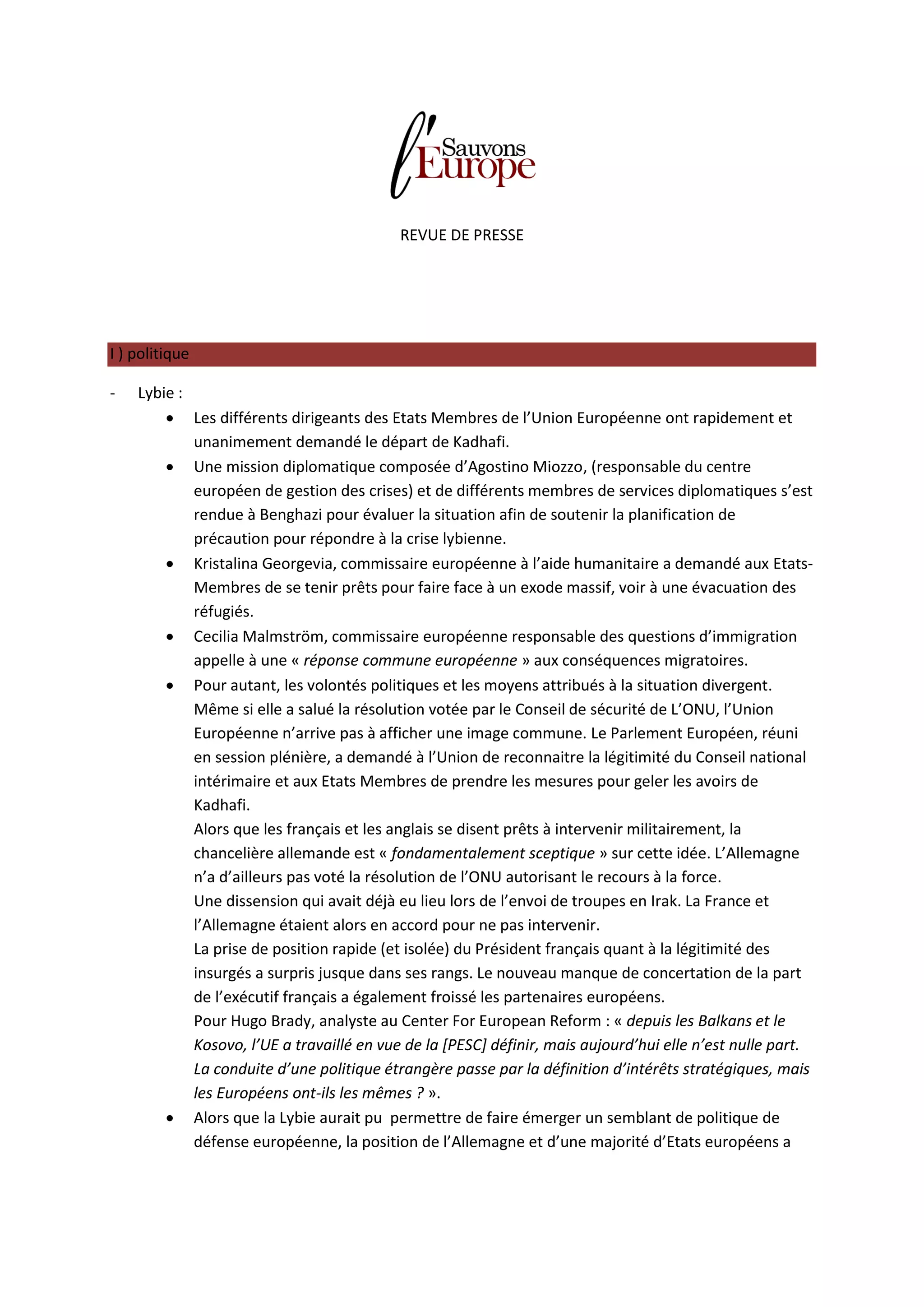 L'Union européenne a appelé au départ de Kadhafi en Libye tout en faisant face à des divergences internes sur l'intervention militaire, illustrées par le scepticisme de l'Allemagne et d'autres États membres. Parallèlement, l'UE renforce sa coopération avec la Tunisie et le Maroc pour soutenir la transition démocratique et le développement économique, en introduisant des mesures financières significatives. Des sanctions sont imposées à la Côte d'Ivoire, et la Commission européenne surveille les politiques économiques tout en exhortant à une rigueur budgétaire accrue.