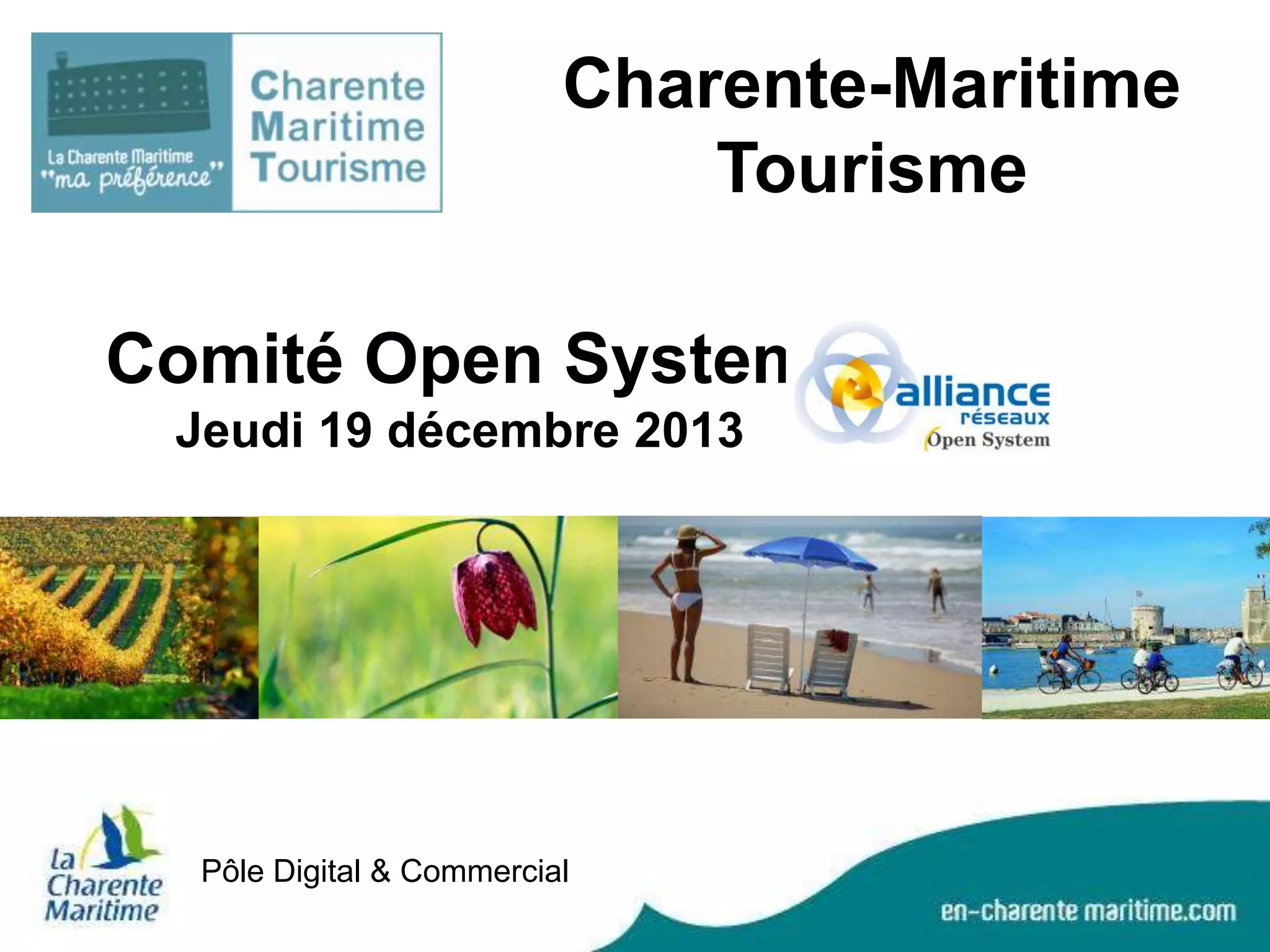 Le document présente un bilan des activités touristiques en Charente-Maritime pour 2013, ainsi que les orientations pour 2014. Il détaille les outils et actions mis en place pour développer la distribution en ligne des offres touristiques, ainsi que l'évolution des partenariats et des ventes. Les axes principaux de 2014 incluent l'adoption de solutions numériques pour les prestataires et l'amélioration des partenariats locaux.
