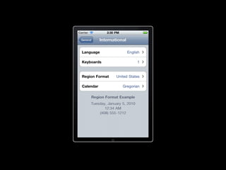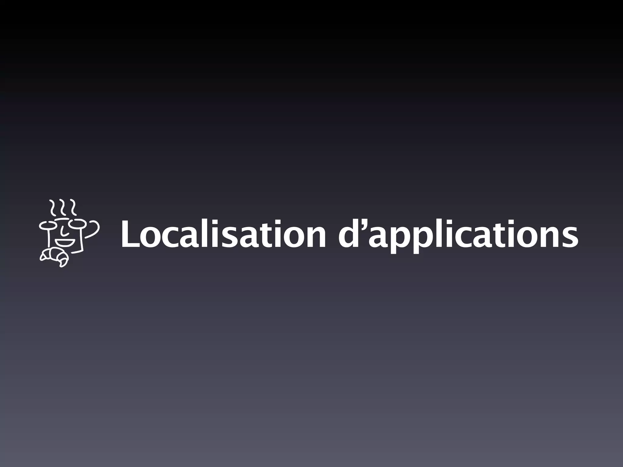 La localisation d'applications améliore l'expérience utilisateur et augmente le nombre de clients. Le document décrit le processus de localisation, y compris la traduction et l'ajustement des éléments d'interface, ainsi que l'utilisation d'outils comme 'genstrings' pour gérer les fichiers de localisation. Des recommandations pratiques sont fournies pour maximiser l'efficacité de la localisation, notamment en évitant la localisation de xibs et en faisant appel à des traducteurs natifs.