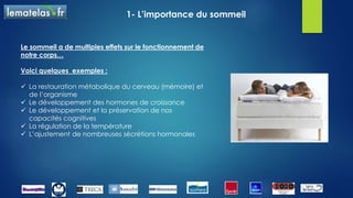 Le document présente des conseils pour améliorer la qualité du sommeil, soulignant l'importance du sommeil pour la santé et les conséquences d'un manque de sommeil. Il insiste sur le choix adéquat de la literie et le respect de son organisme, tout en fournissant des recommandations pratiques pour bien dormir. Enfin, des positions de sommeil optimales sont également abordées pour favoriser une meilleure récupération.