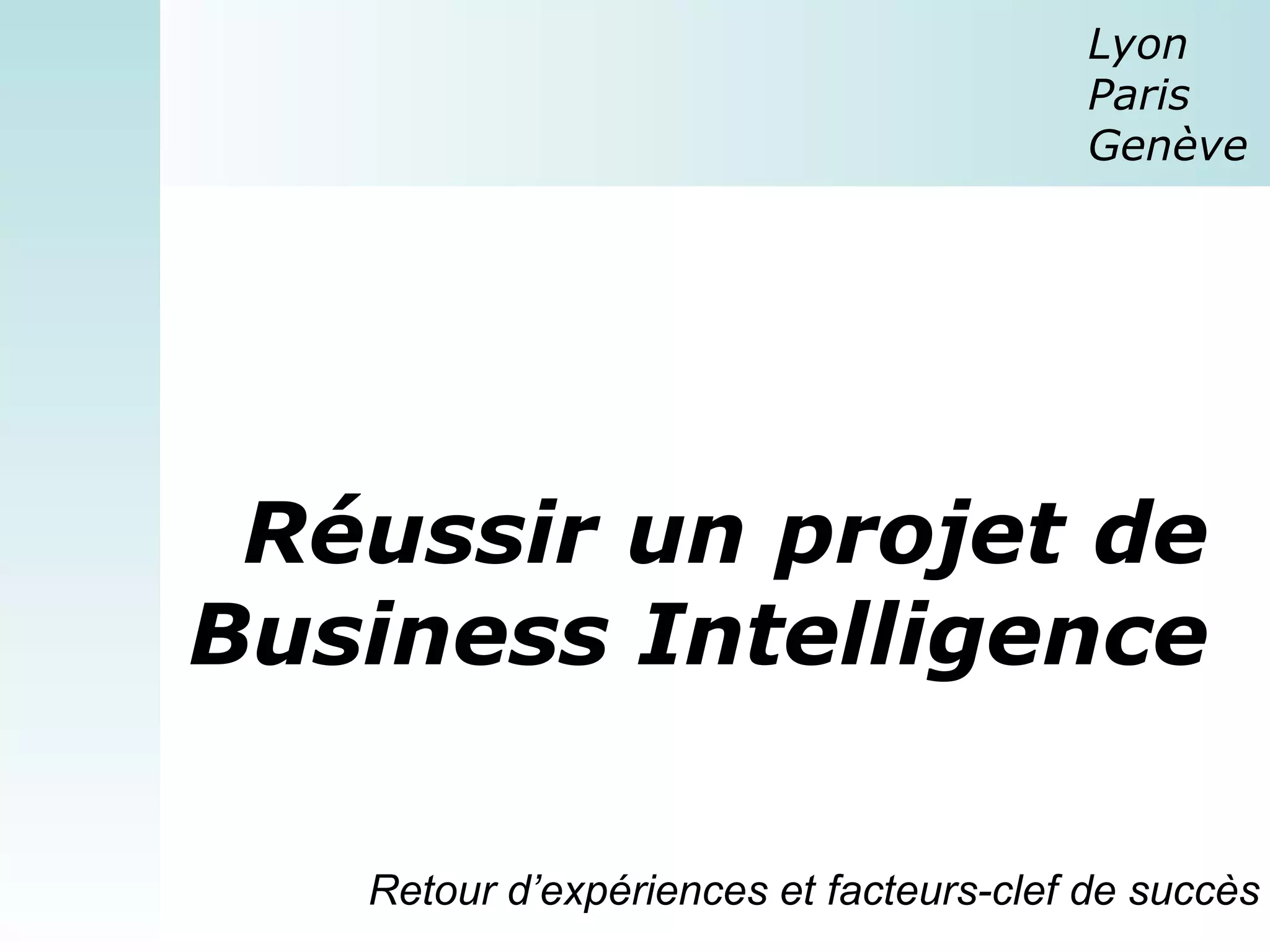 Le document présente des facteurs clés pour réussir un projet de business intelligence, notamment l'importance d'avoir des objectifs clairs et d'impliquer les parties prenantes. Il souligne également la nécessité de transparence et de gestion du changement tout en évitant les technologies inappropriées et la résistance au changement. En somme, le succès repose sur une stratégie consciente et la collaboration au sein de l'organisation.