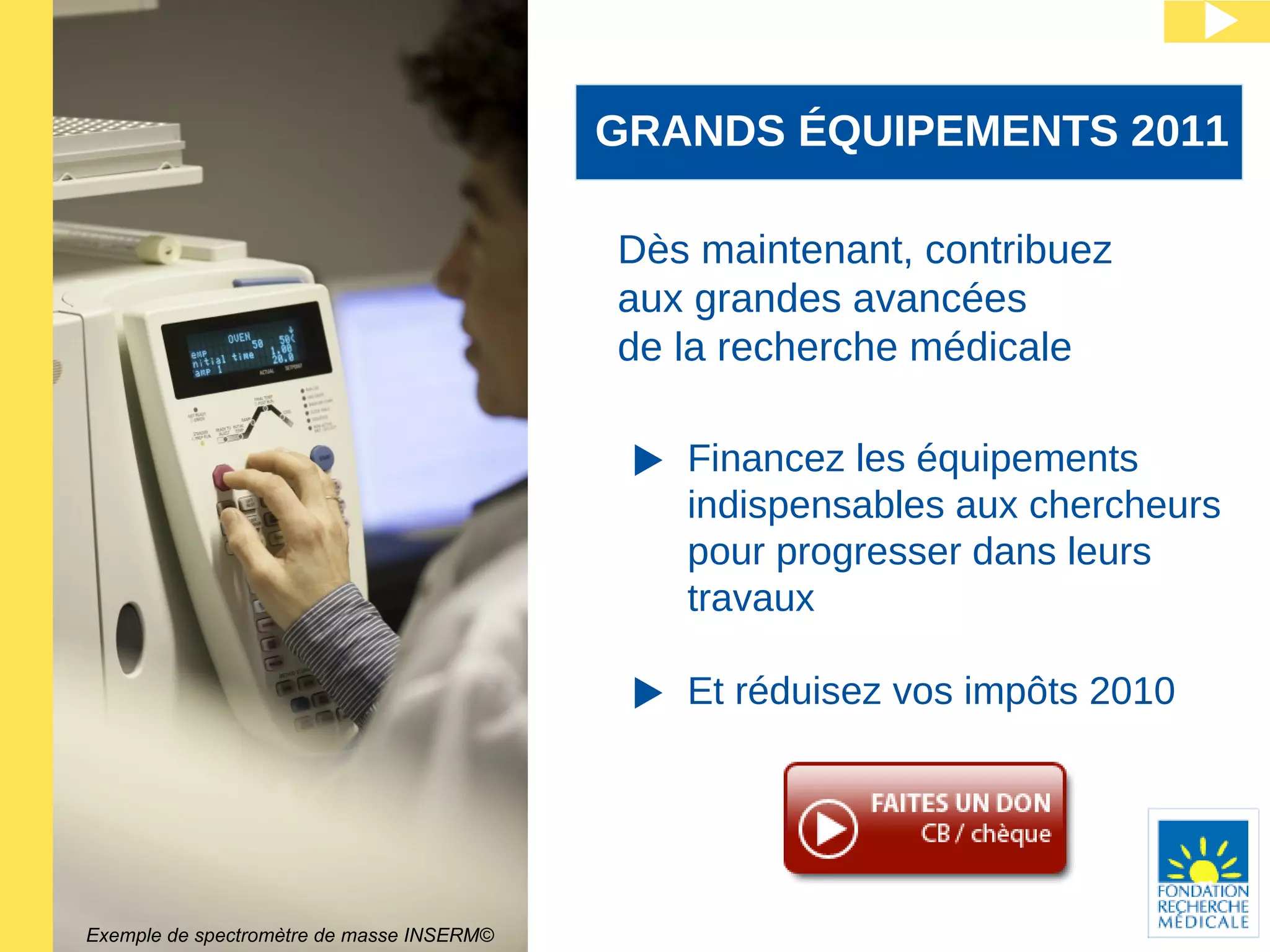 Le programme « grands équipements 2011 » de la fondation pour la recherche médicale finance des équipements essentiels pour la recherche sur diverses maladies, permettant aux chercheurs d'améliorer leur compréhension et leurs traitements. Le spectromètre de masse est un exemple clé, utilisé pour étudier la maladie d'Alzheimer et l'impact des polluants sur la santé. En contribuant à ce programme, les donateurs peuvent bénéficier de réductions fiscales significatives sur leurs impôts en 2010.