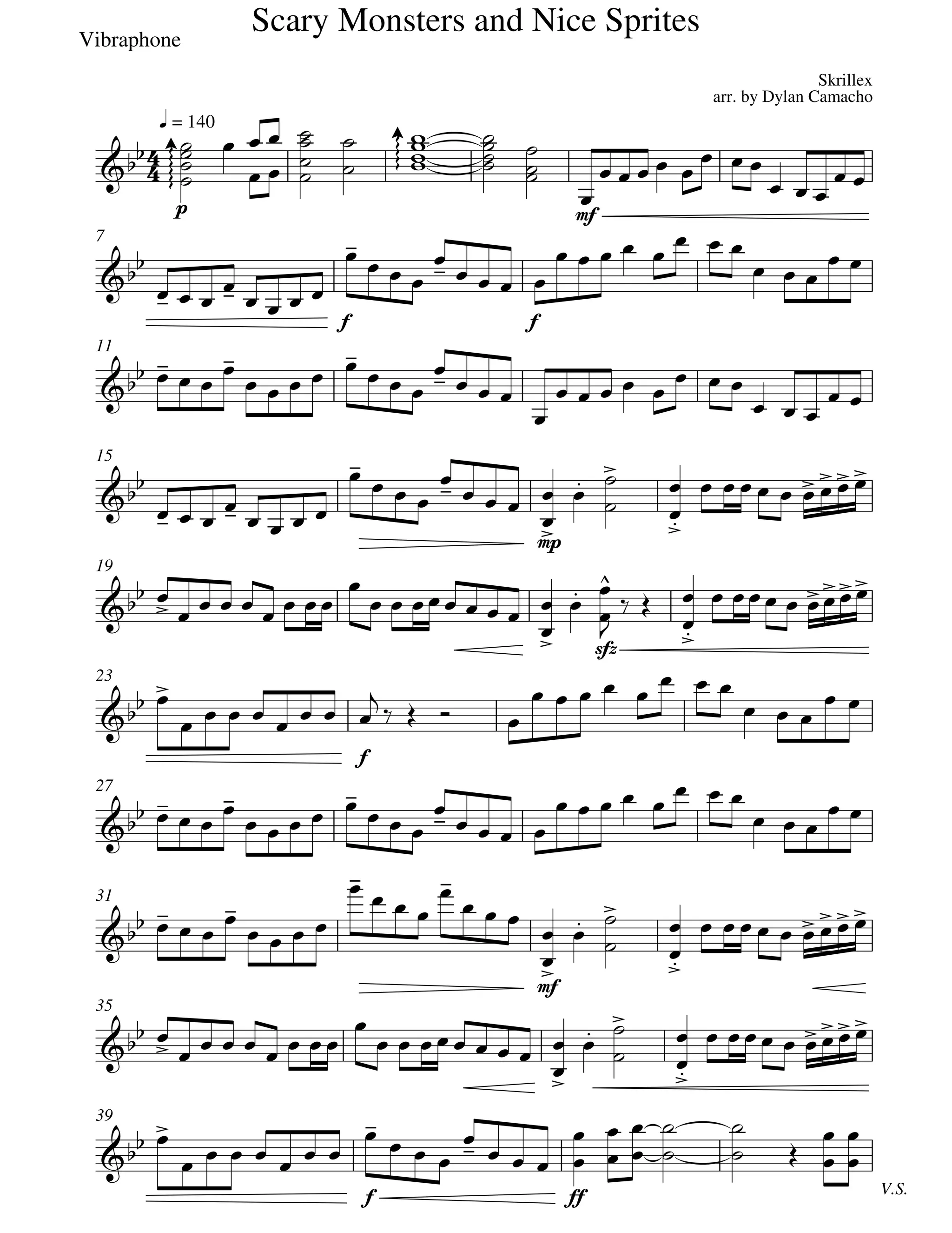 Le document est une partition musicale du morceau 'Scary Monsters and Nice Sprites' de Skrillex, arrangée pour vibraphone par Dylan Camacho. Il contient des indications de tempo, de dynamique et des annotations pour l'interprétation. La structure de la pièce est clairement délimitée par des mesures et des notations précises.