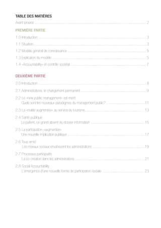 Le document discute l'évolution vers une 'smart gouvernance' dans les administrations, marquée par une intégration accrue des technologies numériques et une participation active des citoyens en tant que co-créateurs de services. Il souligne la nécessité pour les administrations de s'adapter aux changements technologiques et sociétaux, en favorisant l'interopérabilité, la transparence et la décentralisation des services. Finalement, cette transformation implique un changement de paradigme dans la relation entre citoyens et administrations, orientée vers une nouvelle ère de participation et de co-conception.