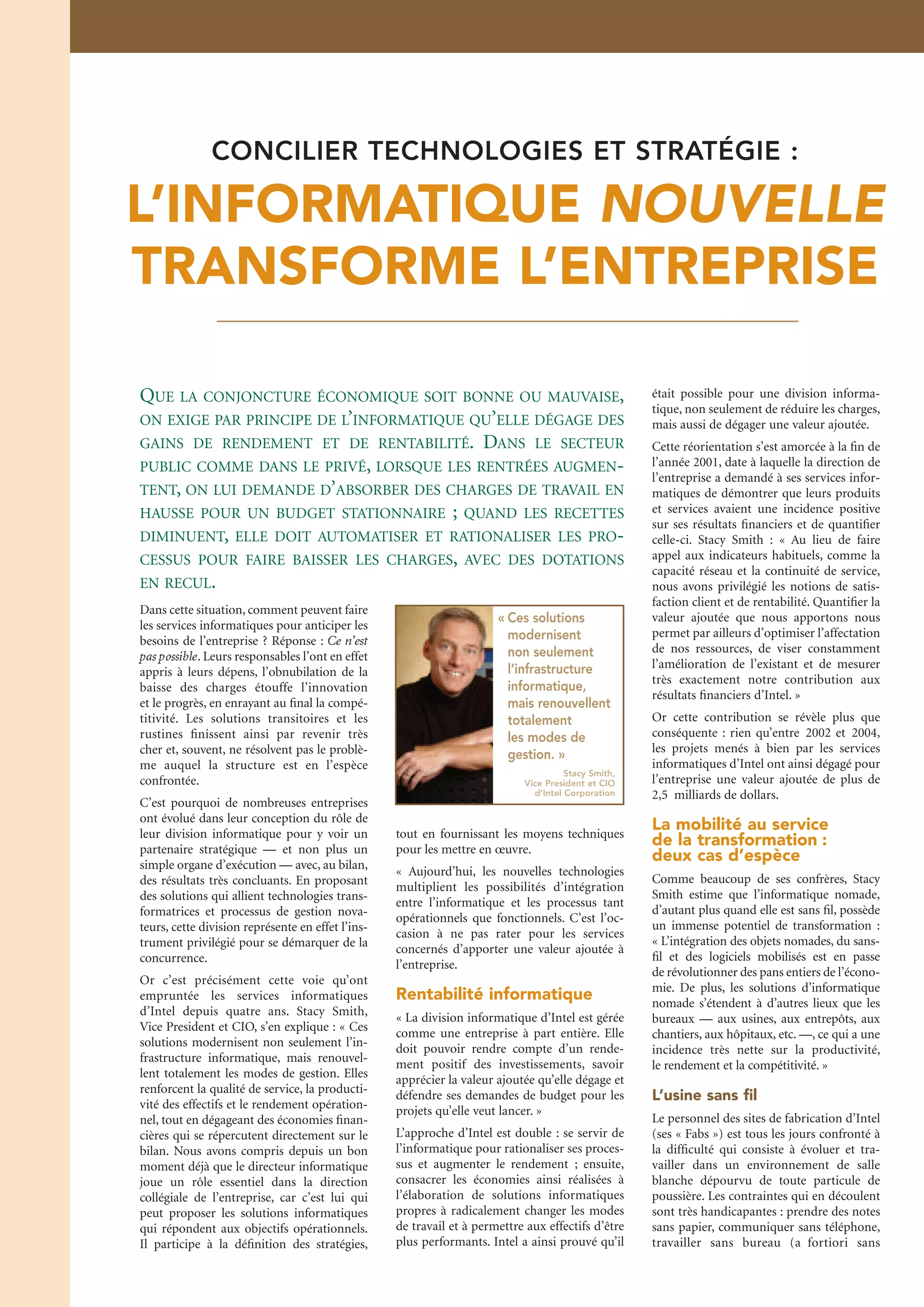Le document traite de la transformation des services informatiques d'Intel en un partenaire stratégique générant de la valeur ajoutée, au lieu d'être simplement un organe d'exécution. De nouvelles technologies, comme l'informatique nomade, sont mises en avant pour améliorer la productivité et l'efficacité des opérations. L'importance de l'innovation et de l'optimisation des processus est soulignée pour maintenir la compétitivité de l'entreprise.