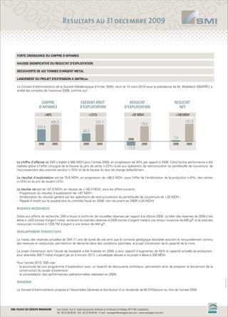 Au 31 décembre 2009, SMI a connu une forte croissance avec un chiffre d'affaires de 466 MDH, en hausse de 40%, et un résultat net de 147,9 MDH, augmentant de 140%. Les réserves d'argent ont été confirmées à 432 tonnes, portant le total à 2426 tonnes, et un projet d'extension visant à augmenter la capacité de production de 50% a été lancé avec un budget de 300 MDH. Le conseil d'administration a aussi proposé un dividende de 60 DH par action.