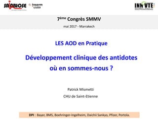 Le document traite du développement clinique des antidotes pour les anticoagulants oraux directs (AOD) comme le dabigatran. Il présente des données sur l'efficacité des antidotes, en particulier l'idarucizumab, et discute des implications des surdosages et des situations cliniques critiques. Les résultats montrent que l'idarucizumab est efficace pour inverser les effets du dabigatran, mais que des considérations de dose et de pharmacocinétique sont cruciales dans des contextes particuliers.