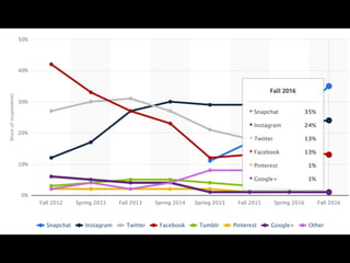 Snapchat compte 150 millions d'utilisateurs quotidiens, avec une majorité de femmes et un usage intensif, où les utilisateurs passent 20 à 30 minutes par jour. La plateforme est plus populaire que la télévision chez les 18-30 ans et utilise des mécanismes de ludification tels que les filtres et les trophées pour engager les utilisateurs. Snapchat se distingue des autres réseaux sociaux par son caractère éphémère et la diversité des contenus, notamment des vidéos vues en quantité supérieure à celles sur Facebook.