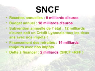 Le document présente une analyse critique de la situation financière et professionnelle des conducteurs de TGV à la SNCF, soulignant un salaire élevé, de nombreux avantages et une charge de travail réduite. Il aborde également le financement public massif dont bénéficie la SNCF à travers des subventions et des dettes à rembourser. Enfin, il met en lumière le taux élevé de grèves au sein de l'entreprise, attirant l'attention sur l'impact de ces mouvements sur les usagers.