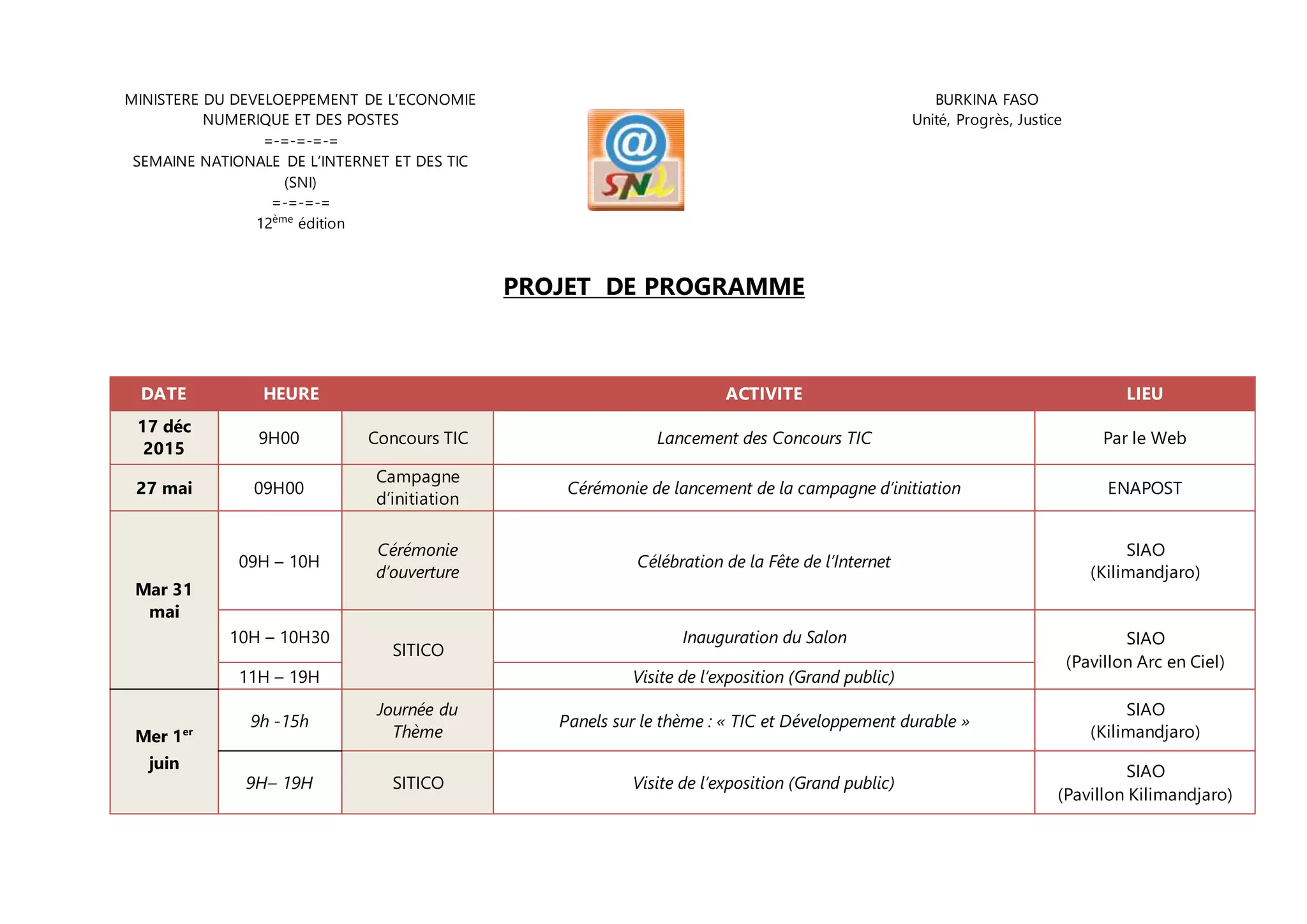 Le document présente le programme de la 12ème édition de la Semaine Nationale de l'Internet et des TIC au Burkina Faso, prévue du 17 mai au 4 juin 2015. Il inclut diverses activités telles que des concours TIC, des panels sur le développement durable, une cérémonie d'ouverture, et des visites d'expositions. L'événement vise à promouvoir l'unité, le progrès et la justice à travers les technologies de l'information et de la communication.