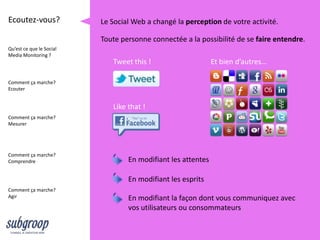 Le document présente le concept du social media monitoring, qui permet d'écouter et d'analyser les conversations en ligne concernant une marque ou une entreprise. Il souligne l'importance de mesurer les discussions, d'identifier les influences et de comprendre l'impact sur la réputation. Des étapes pratiques sont proposées, telles que l'écoute, la mesure et l'action, pour élaborer une stratégie efficace sur les réseaux sociaux.