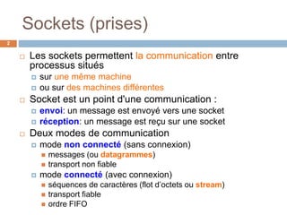 Le document traite des sockets, qui permettent la communication entre processus sur une même machine ou sur des machines différentes, en détaillant leurs modes de communication (connecté et non connecté) ainsi que les protocoles associés (TCP et UDP). Il explique également la création, l'attribution d'adresses externes, et la gestion des connexions, y compris les étapes pour établir une communication client-serveur. Enfin, le document fournit des exemples de code et des structures nécessaires pour la programmation des sockets en C.