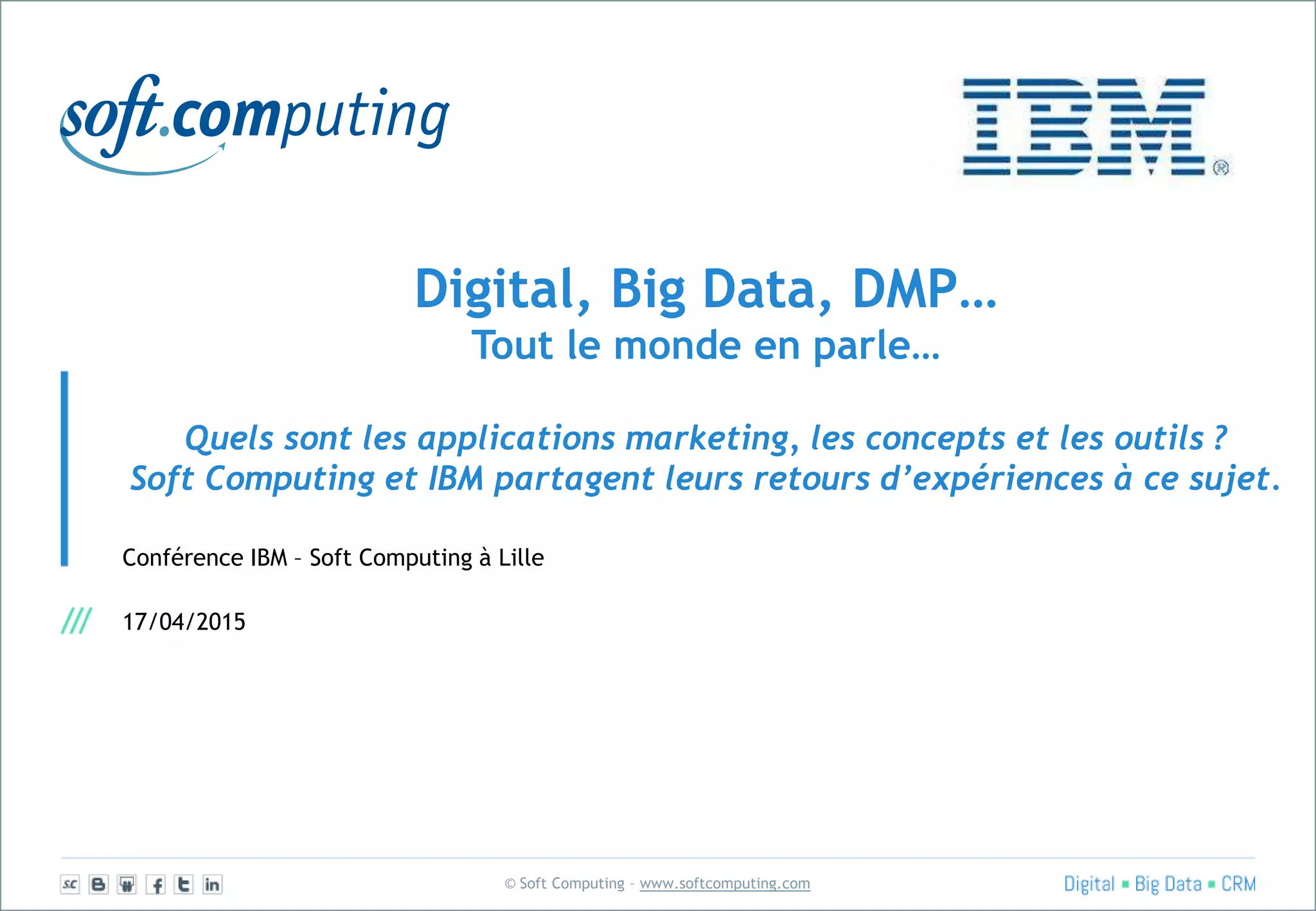 Le document présente une conférence sur l'impact du big data et des outils numériques dans le marketing, en soulignant les défis contemporains auxquels les entreprises font face pour intégrer des interactions client multicanal. Il aborde également l'offre d'IBM et de Soft Computing, ainsi que des études de cas sur des parcours clients optimisés grâce à l'analyse de données. L'événement met en avant des solutions analytiques novatrices pour améliorer l'expérience client et le processus décisionnel.