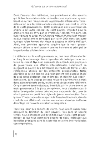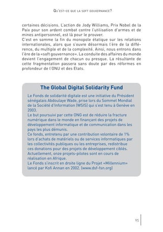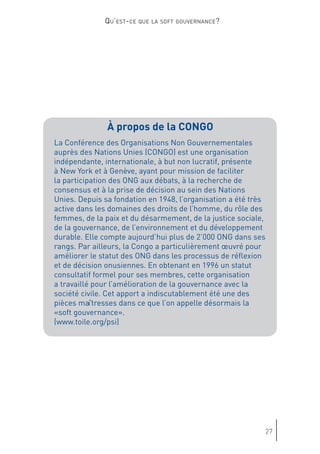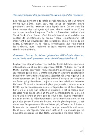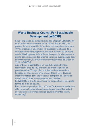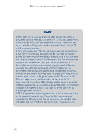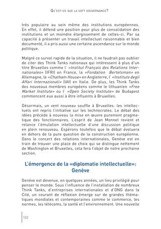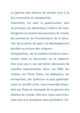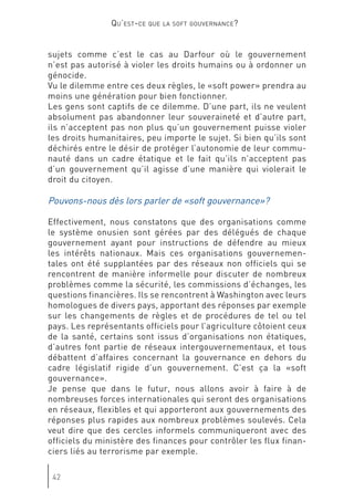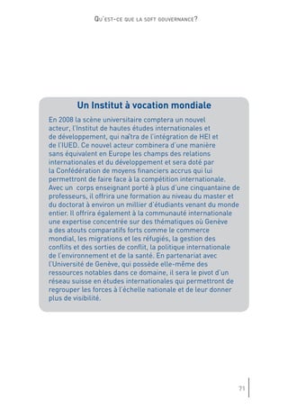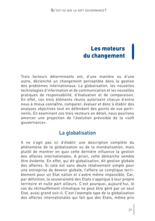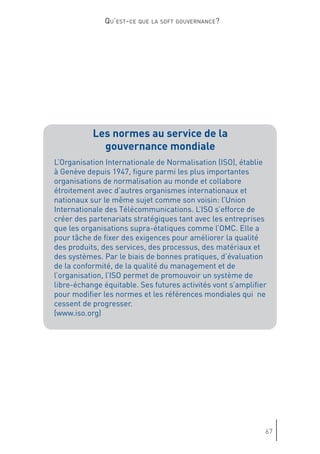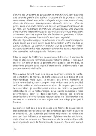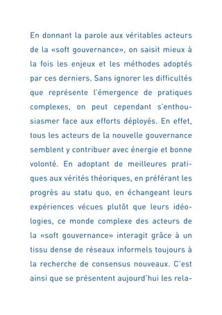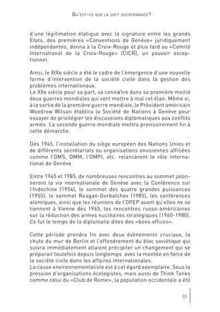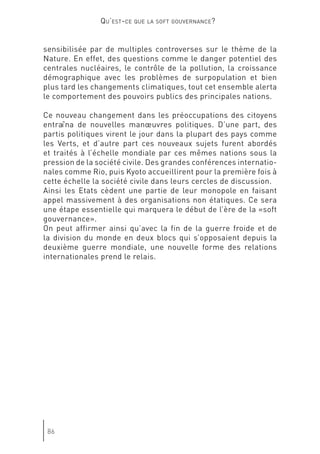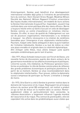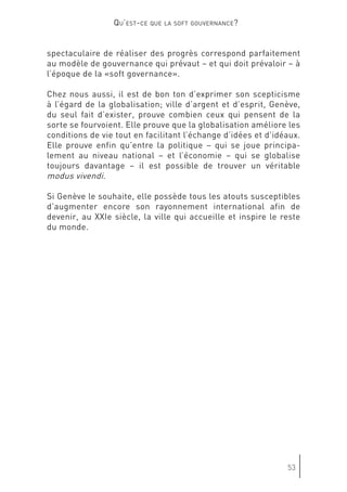 Le document discute de l'évolution de la gouvernance mondiale et de l'impact croissant des acteurs non étatiques, mettant en avant l'importance de la 'soft gouvernance'. Genève est présentée comme un potentiel centre de 'soft power', où la société civile et divers groupes d'intérêts redéfinissent les rôles dans le processus décisionnel. Cette transformation souligne la nécessité d'une coopération entre États et organisations non gouvernementales pour répondre aux défis globaux.
