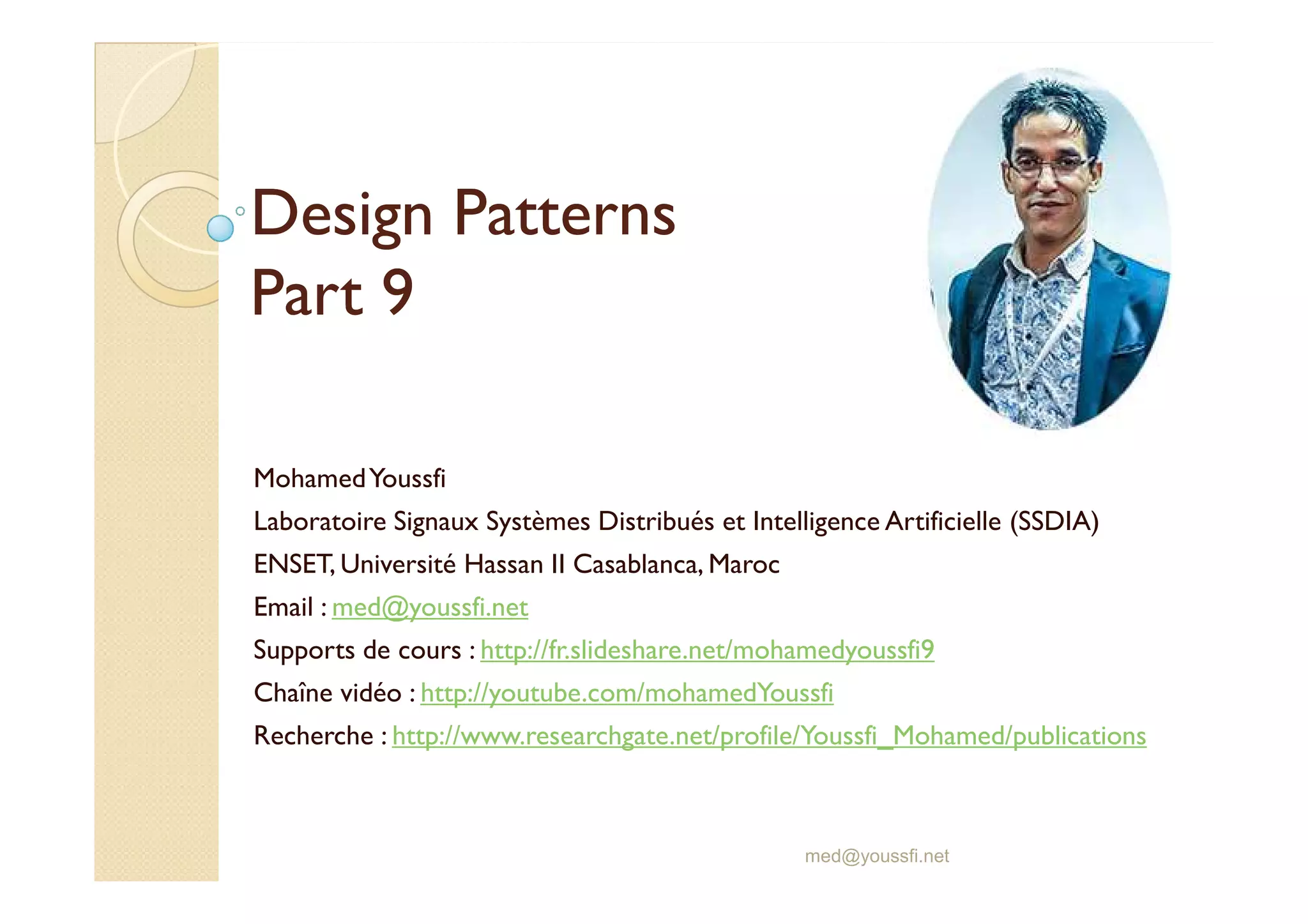 Le document traite des design patterns en programmation, notamment l'Abstract Factory, le Singleton et le Prototype, en expliquant leurs objectifs, leurs responsabilités et leur implémentation. Ces patterns facilitent la création d'objets, garantissent l'unicité d'une instance, et offrent des méthodes pour cloner des objets existants. Des exemples de code en Java illustrent chaque pattern et leur utilisation dans des applications multi-thread.