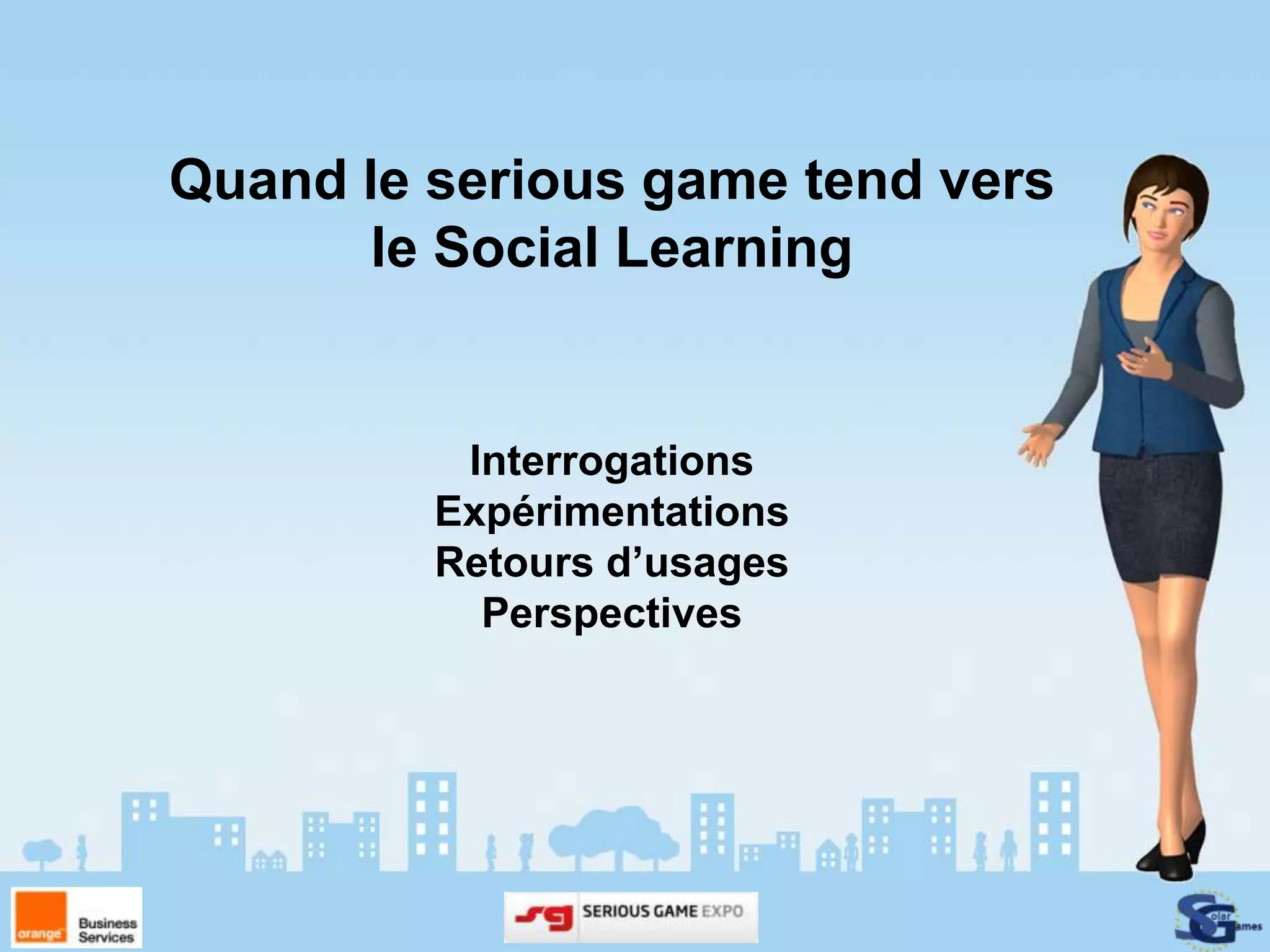 Le document présente l'évolution des serious games vers un apprentissage social, abordant les défis de la formation à distance et l'engagement des apprenants. Il souligne l'importance de créer des liens collaboratifs et d'optimiser les coûts de formation tout en intégrant des mécaniques ludiques et des outils interactifs. Des résultats d'expérimentation montrent une meilleure adhésion et efficacité des formations à travers une approche innovante et collaborative.