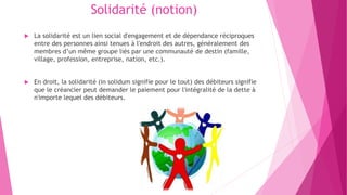 La solidarité est un lien social basé sur des engagements réciproques entre individus au sein d'une communauté. Elle se manifeste par des actions d'aide envers les plus vulnérables, incluant une dimension transgénérationnelle et écologique depuis les années 1990. Diverses organisations, comme la Fondation Brageac et France Volontaires, œuvrent pour soutenir des initiatives de solidarité à échelle nationale et internationale.