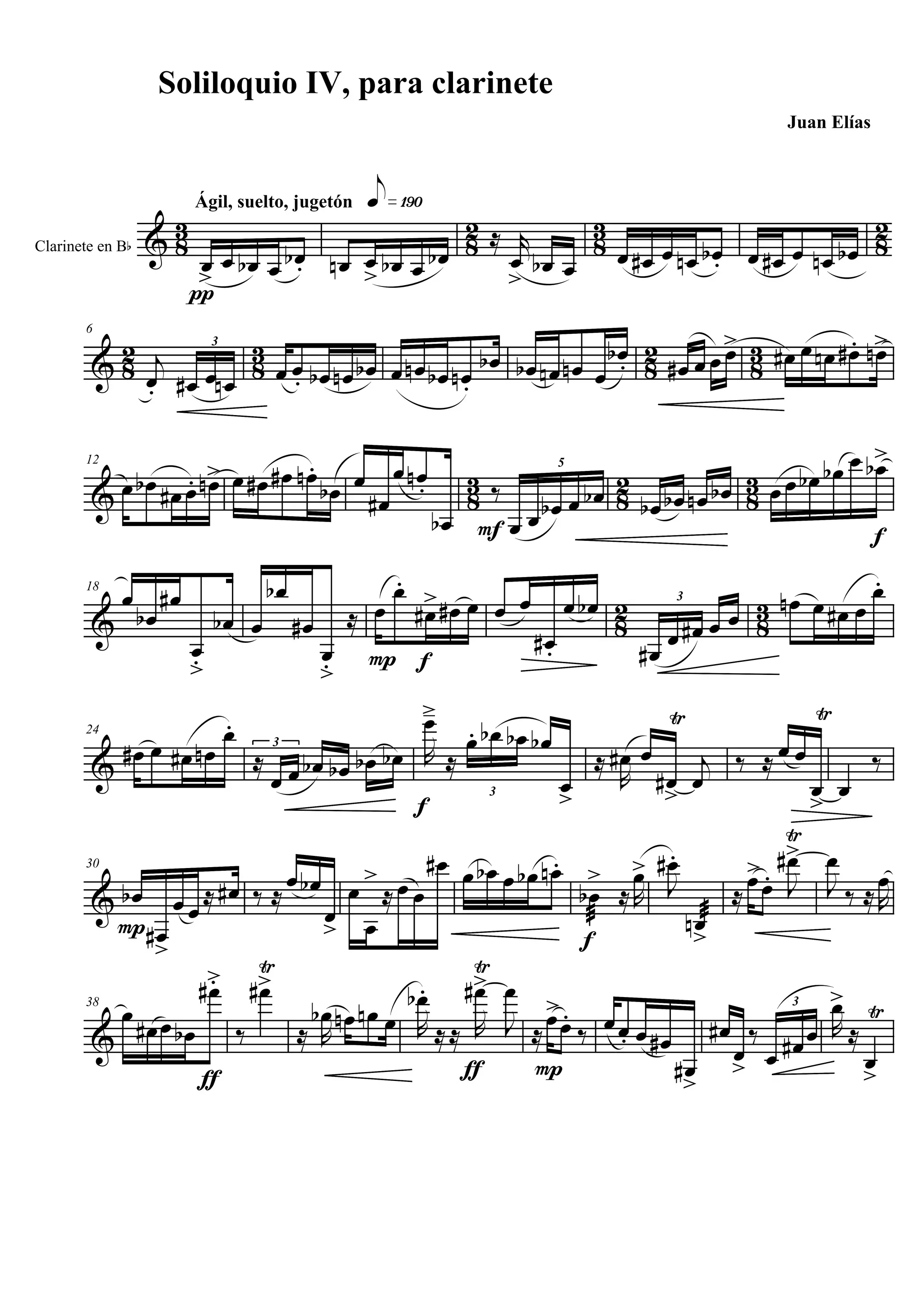 Le document présente une composition musicale intitulée 'Soliloquio IV' pour clarinette, évoquant des indications de tempo et des techniques de jeu spécifiques comme le frulato et le glissando. Il contient des notations mélodiques et rythmiques, offrant des instructions détaillées pour l'interprétation. Cette œuvre semble se concentrer sur l'expression musicale et les dynamiques variées aux instruments à vent.