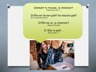 Le document présente des expressions et vocabulaire liés à la mode, permettant d'exprimer des opinions sur les vêtements, soit en complimentant, soit en critiquant. Il inclut des exemples de phrases comme demander si un vêtement est de bon goût, et expliquer pourquoi il ne va pas à quelqu'un. Enfin, il encourage une activité où les participants doivent présenter des tenues et voter pour les meilleures dans différentes catégories.