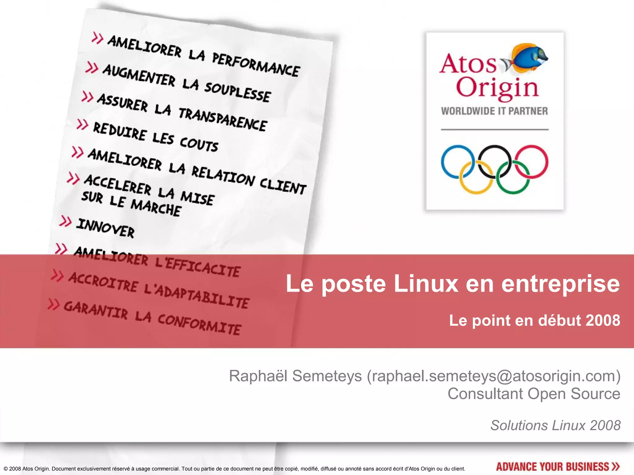 Le document présente les enjeux, contraintes et opportunités liés à l'intégration des postes de travail Linux en entreprise, notamment face à Windows. Il aborde les défis d'intégration, de migration, de sécurité et de gestion de parc, tout en soulignant l'importance de la conduite du changement pour assurer l'adoption réussie de la solution. Enfin, il met en avant les choix structurants pour la standardisation et la sélection de distributions Linux adaptées aux besoins de l'entreprise.