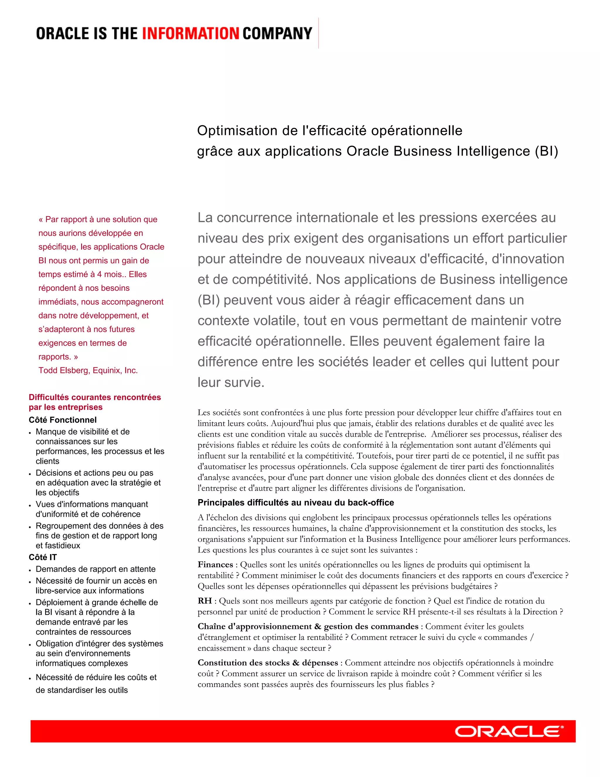Les applications Oracle Business Intelligence (BI) améliorent l'efficacité opérationnelle et la compétitivité des entreprises en fournissant des informations exploitables et en facilitant l'intégration des données à travers les différentes fonctions. Elles aident à optimiser les processus de prise de décision, la gestion des finances, des ressources humaines et de la chaîne d'approvisionnement tout en réduisant les coûts. Ces solutions permettent également de mieux anticiper les besoins futurs et d'améliorer la visibilité des performances organisationnelles.