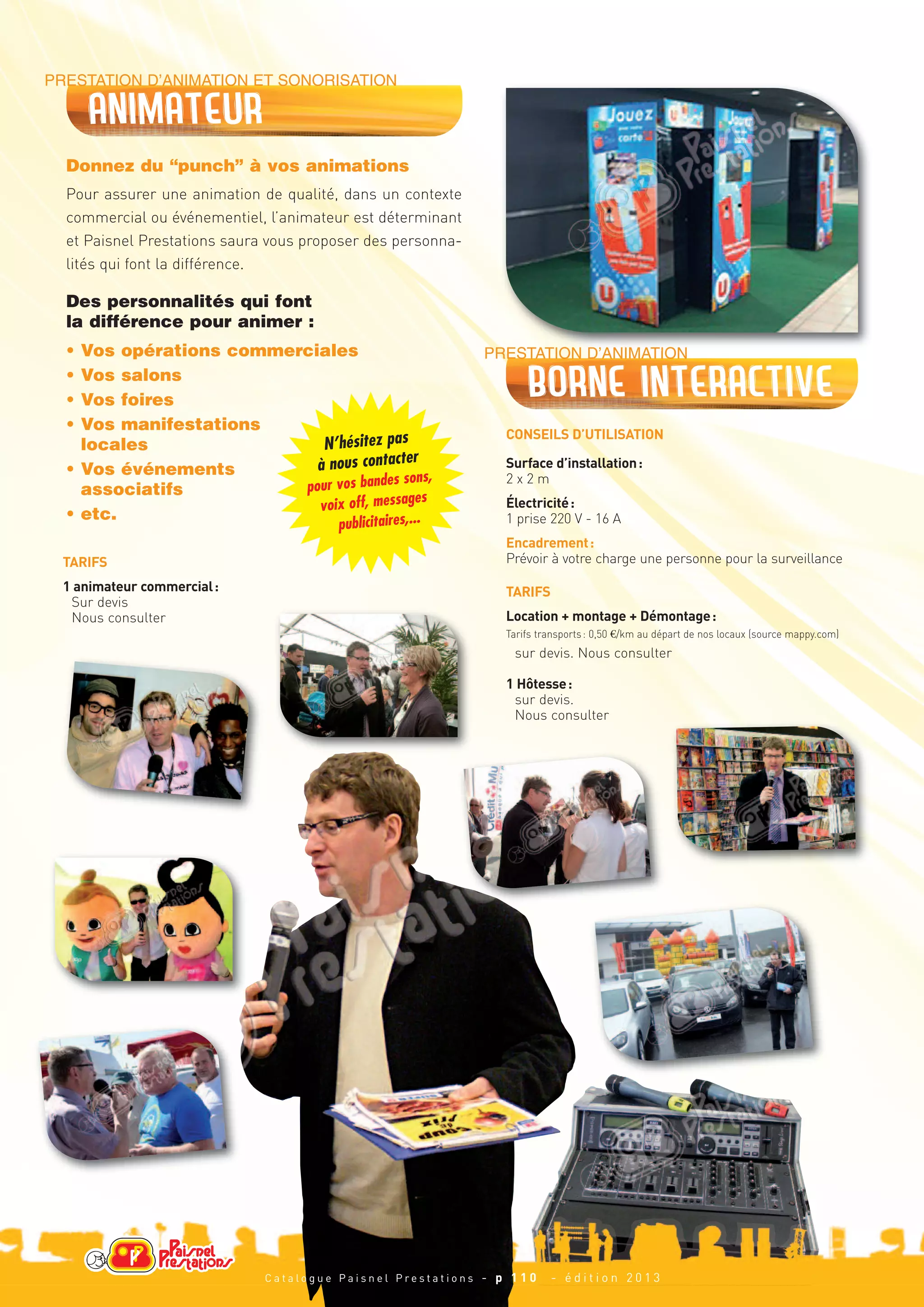 Paisnel Prestations propose des services d'animation pour événements commerciaux et privés, incluant des animateurs, des jeux interactifs et des effets spéciaux comme la neige et la mousse. Les tarifs sont sur devis selon la durée et le type de prestation, et le matériel sonore et visuel est de qualité professionnelle. La société assure également la logistique de transport et l'installation des équipements nécessaires.