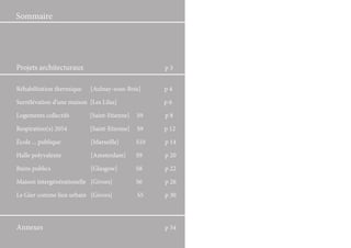 Le document présente divers projets architecturaux, incluant des réhabilitations thermiques et des surélévations visant à améliorer le cadre de vie des habitants, notamment à Aulnay-sous-Bois et Les Lilas. Il aborde également un projet de désenclavement à Saint-Étienne, visant à créer des espaces publics et des logements diversifiés, tout en prenant en compte les enjeux de mixité sociale et de dynamisme urbain. Enfin, un projet pour une école à Marseille est proposé, intégrant des espaces accessibles pour animer la vie de quartier autour de nouveaux logements.