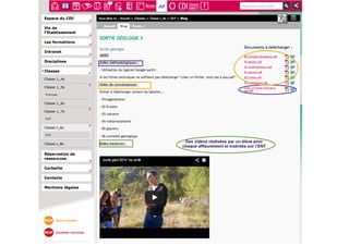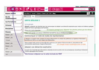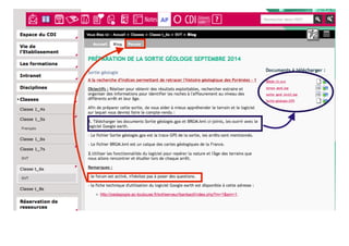 Le document décrit la préparation et l'exploitation d'une sortie géologique, incluant la création d'une page dédiée sur un espace de classe pour les étudiants intéressés. Il mentionne également la réalisation d'un schéma d'interprétation basé sur les photos prises durant la sortie. Enfin, il évoque l'utilisation du logiciel Interwrite Workspace.