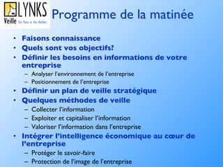 Le document traite de l'importance de la veille stratégique pour aider les entreprises à sortir de la crise plus rapidement que leurs concurrents. Il couvre des aspects tels que l'analyse de l'environnement, la collecte et l'exploitation de l'information, et l'intégration de l'intelligence économique au sein des entreprises. La sensibilisation à la protection des données sensibles et la gestion de l'image de l'entreprise sont également soulignées comme des éléments cruciaux pour la compétitivité.