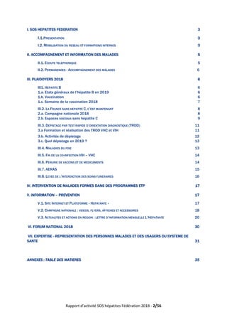 Le rapport d'activité de la Fédération SOS Hépatites pour 2018 souligne les efforts de l'association dans l'accompagnement et l'information des personnes touchées par les maladies hépatiques, ainsi que la mobilisation pour des campagnes de prévention comme 'La France sans hépatite C, c'est maintenant'. Il aborde également la formation de bénévoles et la création d'un réseau de soutien national pour améliorer la qualité de vie des malades. Par ailleurs, le rapport met en évidence l'importance de l'écoute téléphonique et des permanences organisées en région pour apporter un soutien personnalisé.