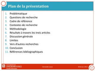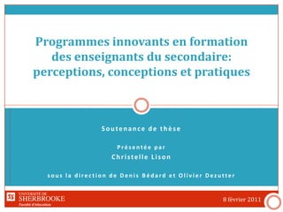 La thèse de Christelle Lison présente une étude sur la perception et la pratique des programmes innovants en formation des enseignants au secondaire à l'Université de Sherbrooke et au Collège universitaire de Saint-Boniface. Les résultats montrent des perceptions positives et des différences significatives entre les deux institutions concernant l'adéquation des activités de programme avec la réalité professionnelle des étudiants. L'étude met en lumière l'importance de l'approche contextualisée et l'engagement académique pour une formation efficace.