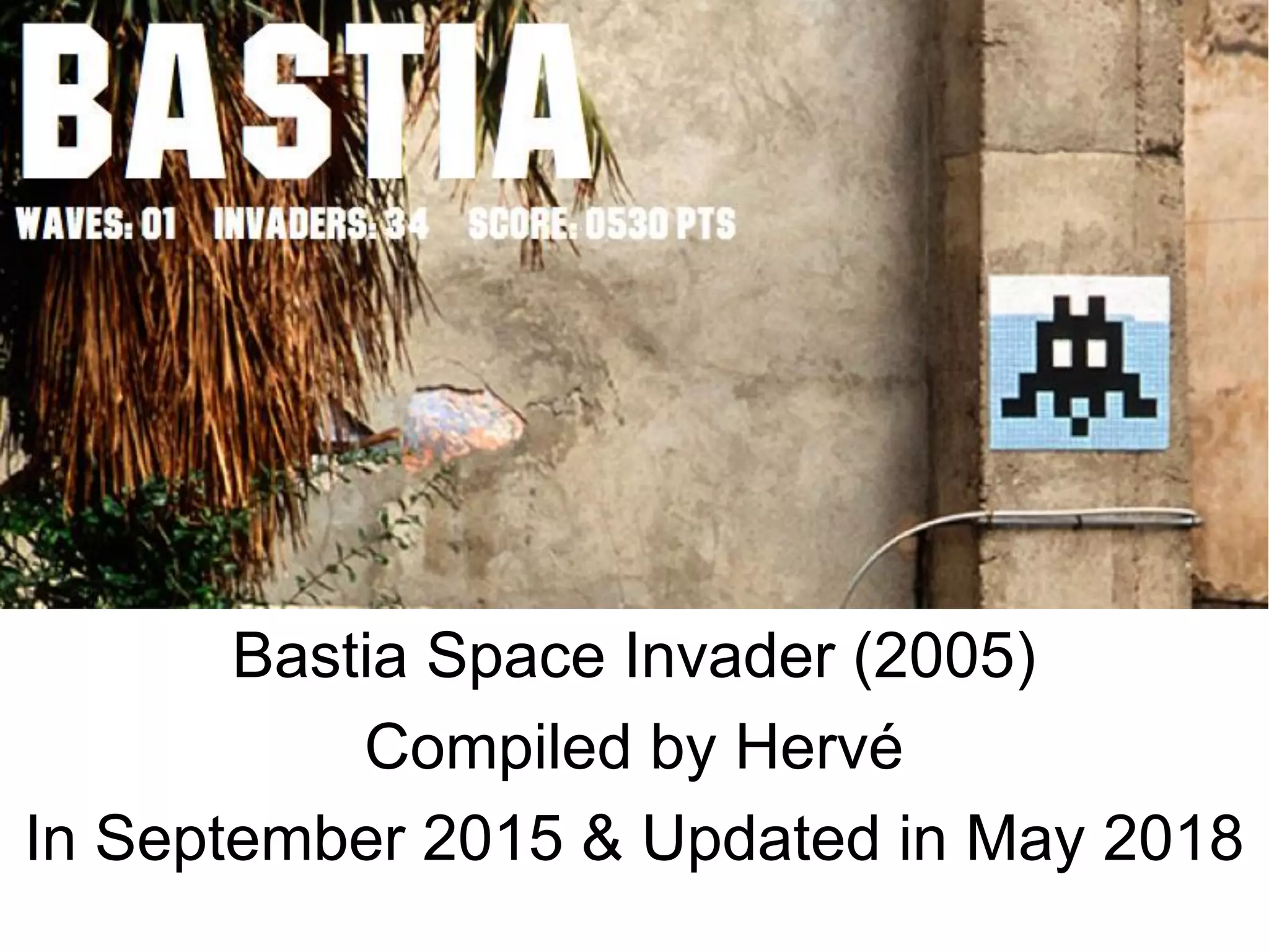 Le document intitulé 'bastia space invader' a été compilé par Hervé en septembre 2015 et mis à jour en mai 2018. Il contient une liste de références et liens utiles liés à des projets sur les 'Space Invaders'. Les différentes sections, identifiées par des codes, regroupent des informations variées sur ce thème.