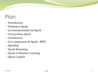 Le document présente Apache Spark, un framework unifié pour le traitement des big data, permettant d'exécuter des applications jusqu'à 100 fois plus vite qu'Hadoop. Il couvre des aspects tels que les RDD, Spark Streaming, Spark SQL, et son architecture master/slave, tout en mettant en avant sa capacité à maintenir des résultats intermédiaires en mémoire. Enfin, il détaille les principaux composants et fonctionnalités qui rendent Spark adapté pour le traitement parallèle et distribué des données.