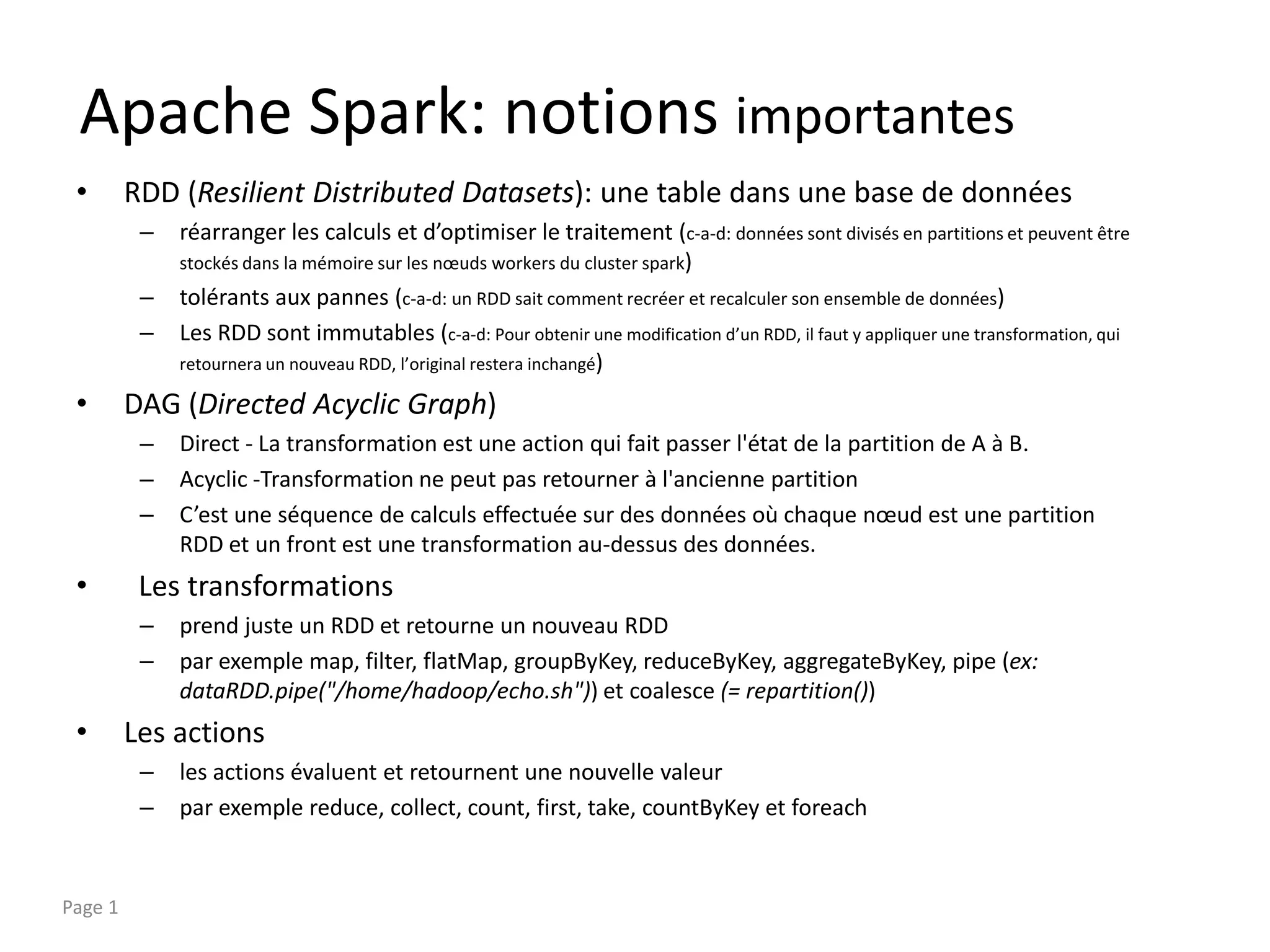 Le document présente les concepts clés d'Apache Spark, notamment les RDD qui sont des ensembles de données distribués résilients. Il explique le fonctionnement des transformations et des actions dans le traitement des données à l'aide d'un DAG et décrit l'architecture d'un cluster Spark incluant un master, un driver et plusieurs workers. Enfin, il mentionne les bibliothèques nécessaires et les méthodes de déploiement en mode standalone avec Docker.
