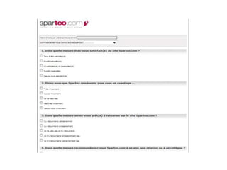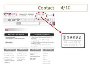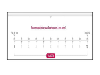 Le document fournit une évaluation de divers aspects d'un service ou d'un produit. Les notes attribuées varient de 4 à 8 sur 10, avec un score global de 6.1 pour le site spartoo.com. Les critères évalués comprennent le contact, le paiement, la livraison, les aspects sociaux, les promotions et l'ergonomie.