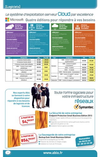 Le document présente une offre diversifiée d'infrastructures et de logiciels, y compris des serveurs, des systèmes d'exploitation, et des solutions de stockage, principalement destinés aux PME. Il décrit les caractéristiques techniques et les options de licence pour plusieurs modèles de serveurs HP et Lenovo. Des informations sur les prix et les fonctionnalités des protections de données et des logiciels de sauvegarde sont également fournies.