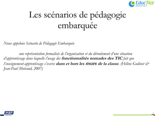 Le document traite des scénarios de pédagogie embarquée dans l'enseignement des langues, mettant en avant l'utilisation des technologies de l'information et de la communication (TIC) à l'intérieur et à l'extérieur de la classe. Il présente également les environnements personnels d'apprentissage (PLE), qui permettent aux apprenants de contrôler leurs outils et services éducatifs selon leurs besoins. Enfin, il aborde les caractéristiques des apprentissages en langue selon le Cadre européen commun de référence pour les langues (CECRL), soulignant l'importance de divers facteurs dans les activités d'interaction et de production.