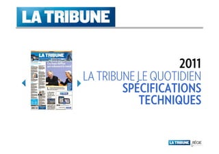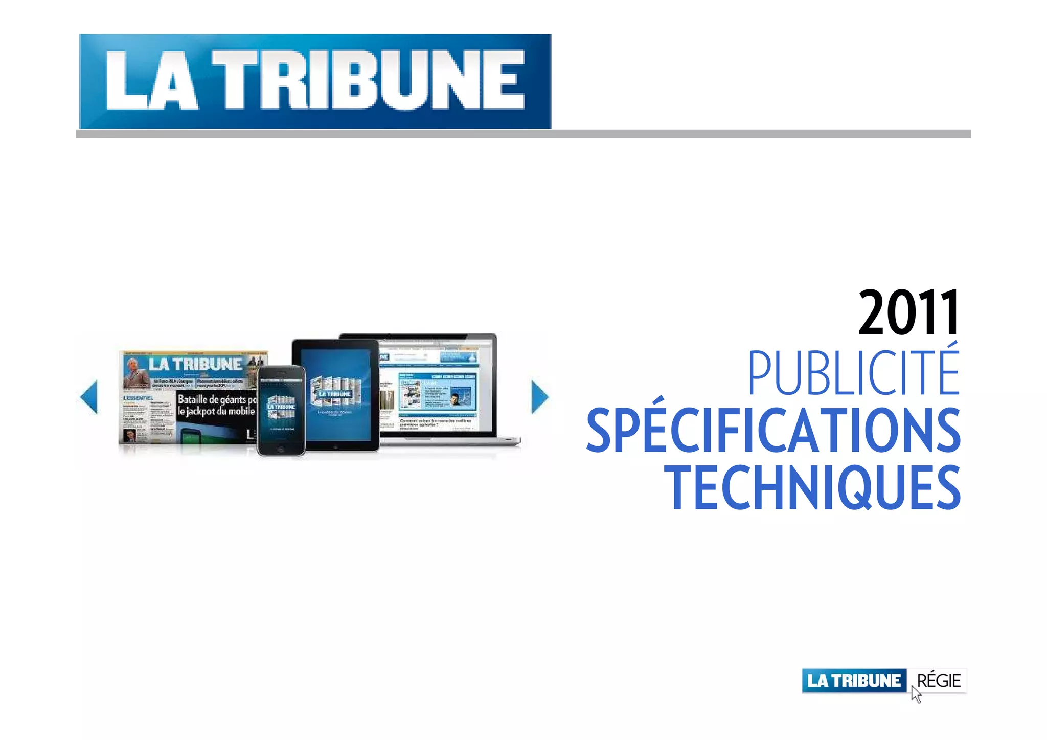 Le document présente les spécifications techniques et les tarifs pour la publicité dans la Tribune pour l'année 2011. Il détaille les formats, contraintes techniques, délais de livraison, et exigences pour les fichiers, notamment en matière de résolution, de poids et de formats acceptés. Des instructions précises sont fournies pour les créations en Flash, vidéo, et autres dispositifs publicitaires, en préconisant l'utilisation de redirections et l'implémentation de clicktags.