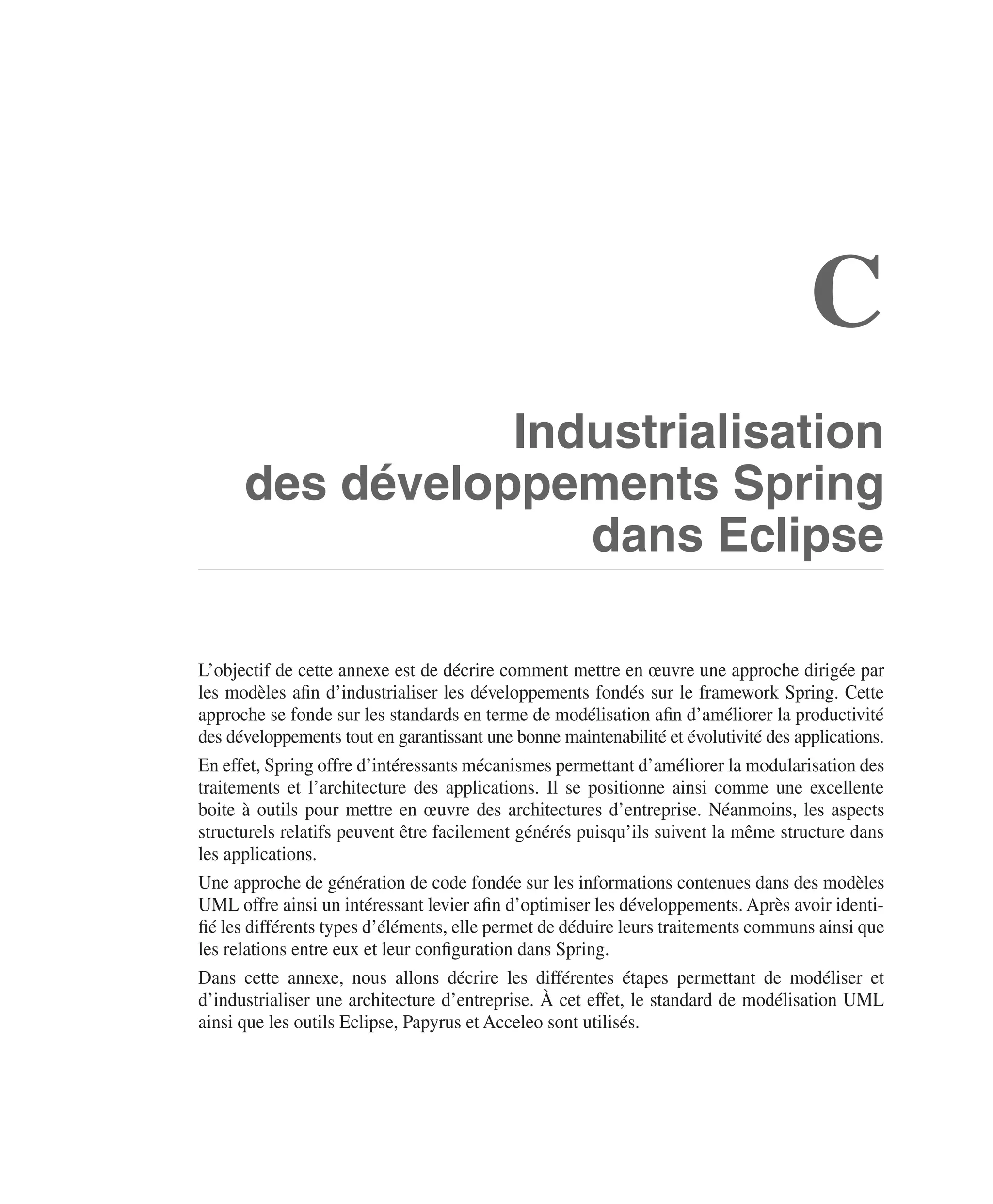 Cette annexe décrit comment industrialiser les développements avec le framework Spring en utilisant une approche dirigée par les modèles, notamment à travers les standards UML et des outils comme Eclipse, Papyrus et Acceleo. Elle explique les concepts de la modélisation UML, la génération de code, ainsi que l'application d'un profil définissant des stéréotypes pour des classes en lien avec les services métier et la gestion des données. L'objectif est d'optimiser la productivité et la maintenabilité des applications tout en facilitant une approche méthodologique pour le développement logiciel.