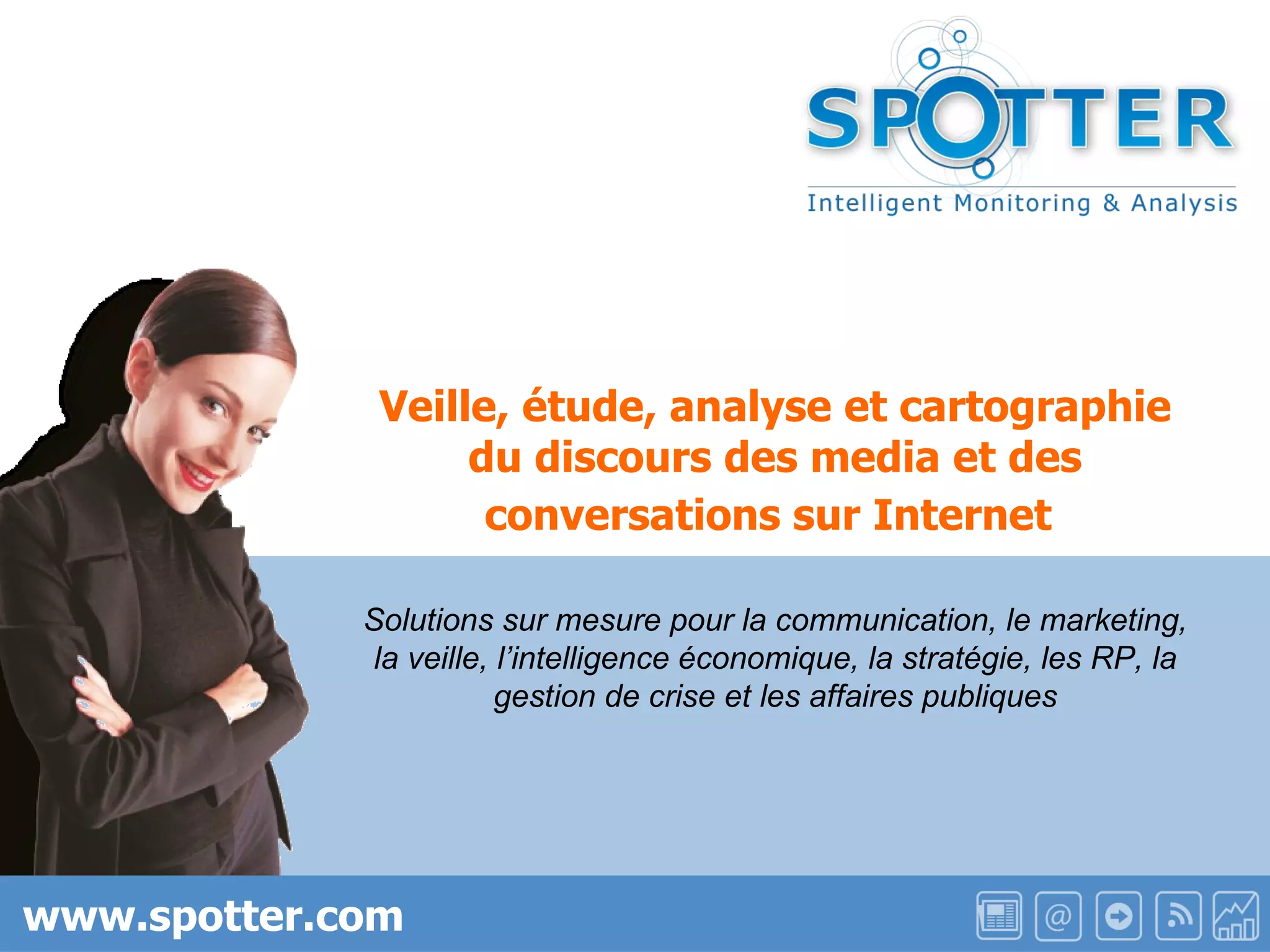 Spotter est une entreprise spécialisée dans la veille et l'analyse du discours médiatique et des conversations en ligne, offrant des outils sur mesure pour le marketing, la communication, et les affaires publiques. Avec des technologies propriétaires, Spotter fournit des analyses quantitatives et qualitatives de l'opinion publique, en s'adaptant aux besoins spécifiques de chaque client. Leur objectif est de transformer les informations et avis fragmentés en leviers stratégiques pour les entreprises et les institutions.
