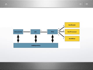 Le document explique le traitement par lots en Java, mettant en avant Spring Batch comme une solution pour organiser, unifier et simplifier les traitements métiers. Il décrit la structure des jobs et des steps, ainsi que les composants essentiels tels que itemreader, itemprocessor et itemwriter. Enfin, il aborde des concepts avancés comme le multithreading et le partitionnement dans le contexte des traitements par lots.
